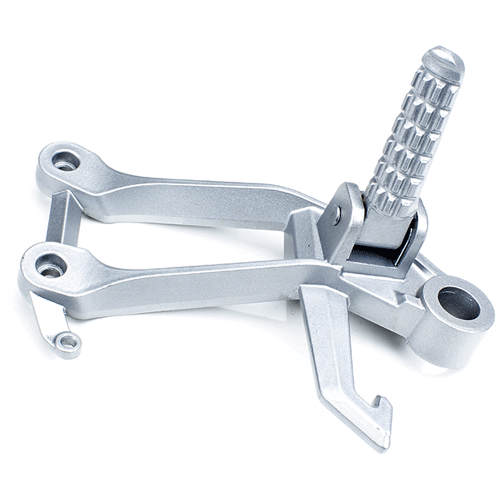 The footpeg with bracket in a motorcycle provides a secure place for the rider's foot while riding, supporting weight and aiding in balance, with the bracket ensuring proper attachment to the frame.