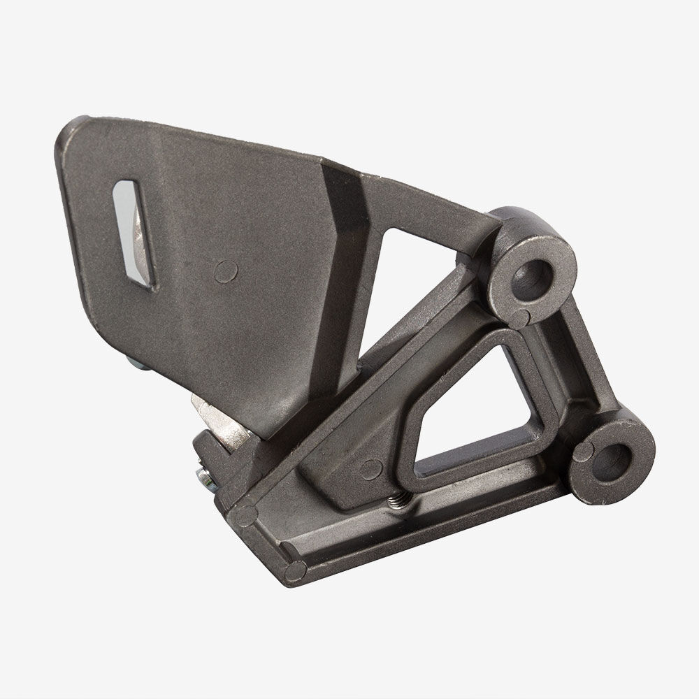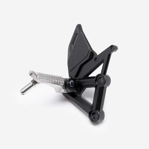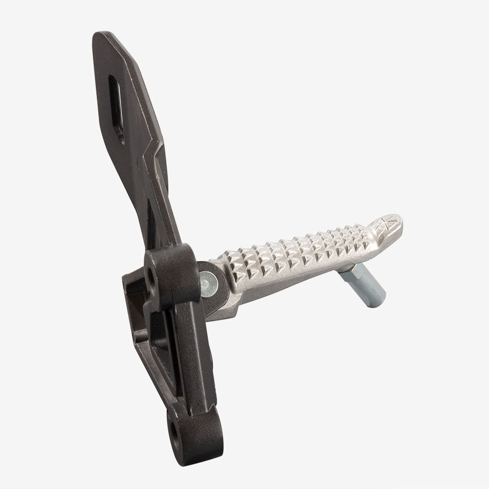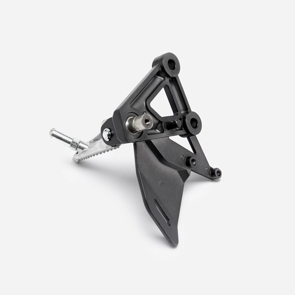 The footpeg with bracket in a motorcycle provides a secure place for the rider's foot while riding, supporting weight and aiding in balance, with the bracket ensuring proper attachment to the frame.