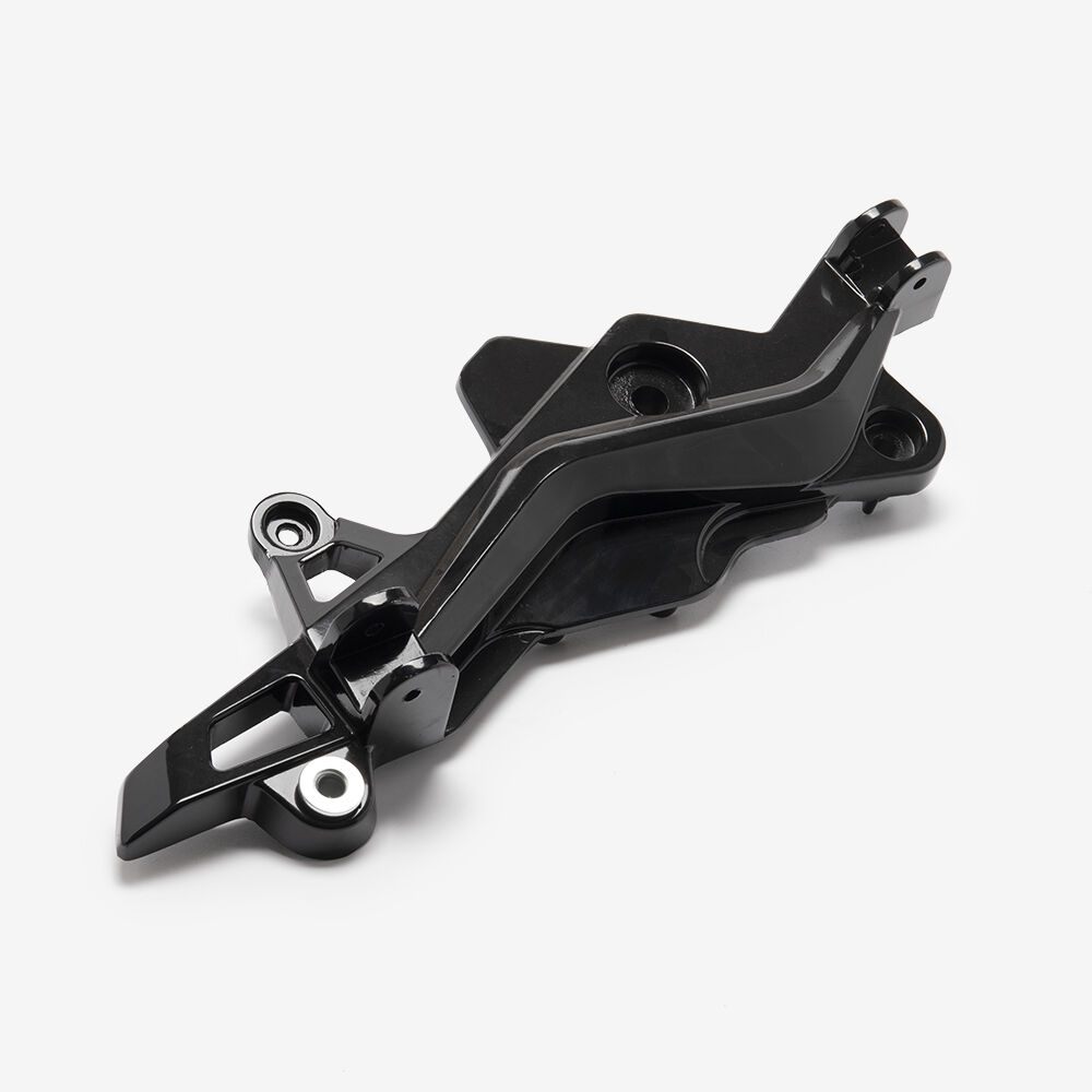 The footpeg with bracket in a motorcycle provides a secure place for the rider's foot while riding, supporting weight and aiding in balance, with the bracket ensuring proper attachment to the frame.