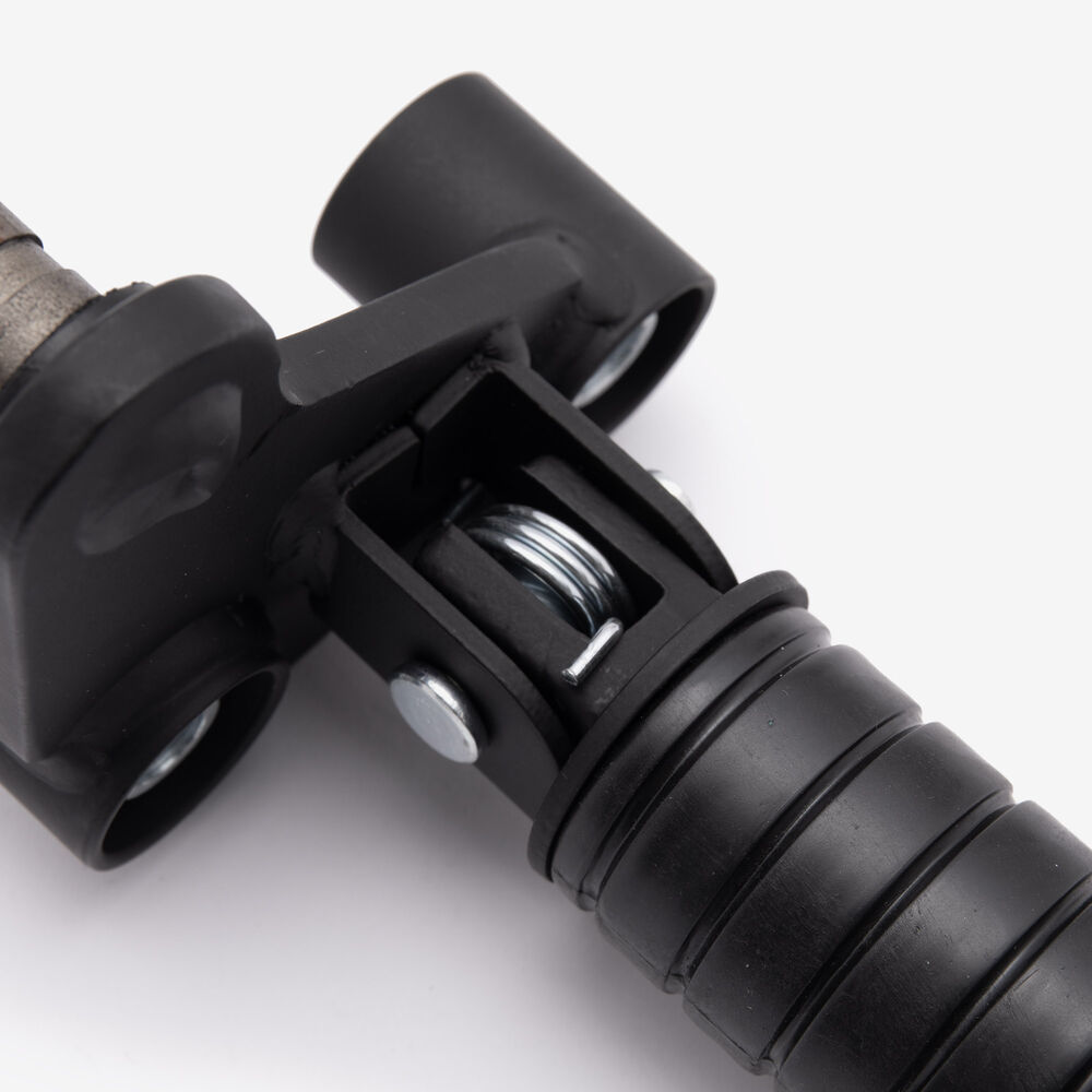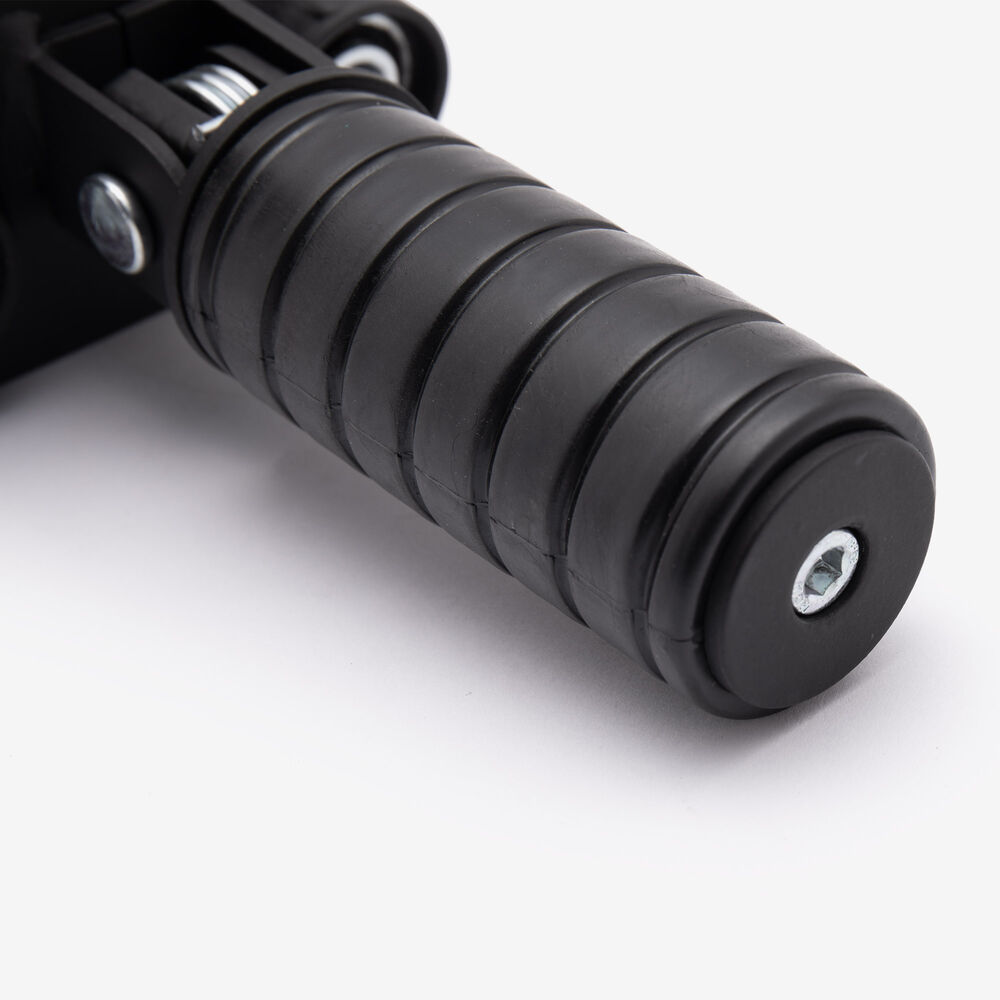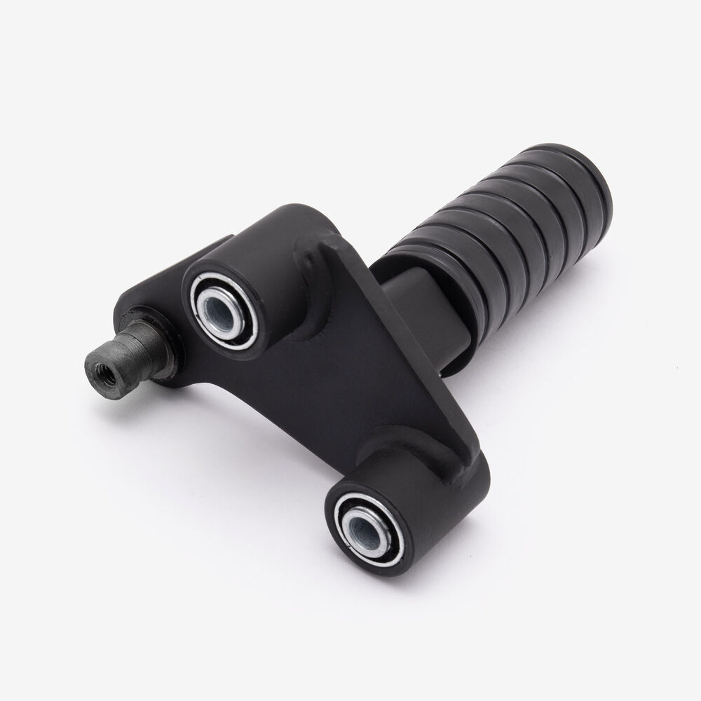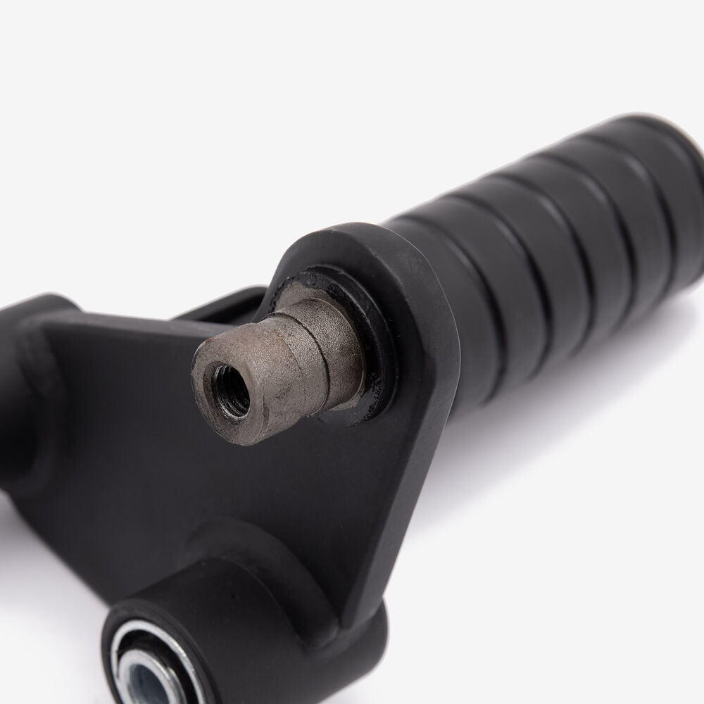 The footpeg with bracket in a motorcycle provides a secure place for the rider's foot while riding, supporting weight and aiding in balance, with the bracket ensuring proper attachment to the frame.