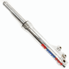 The left suspension fork in a motorcycle supports the front wheel, absorbs shocks from the road, and provides stability and control during riding, contributing to overall handling and comfort.