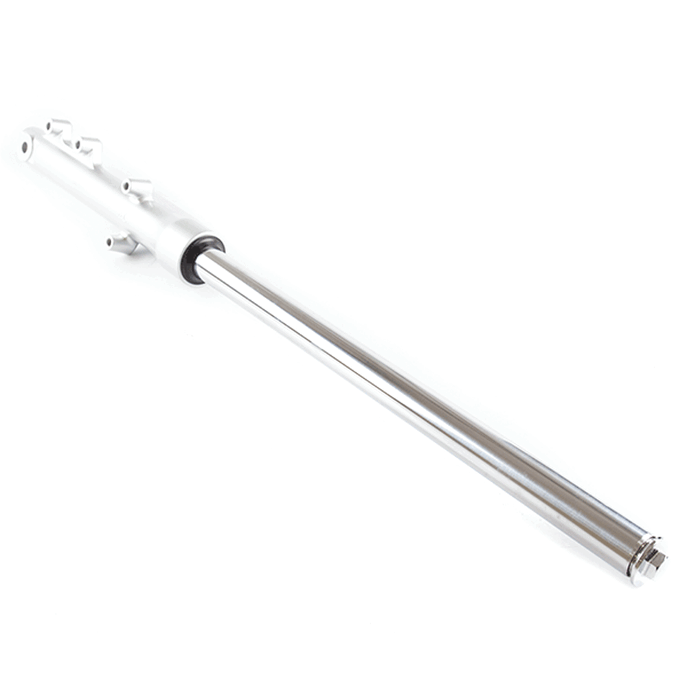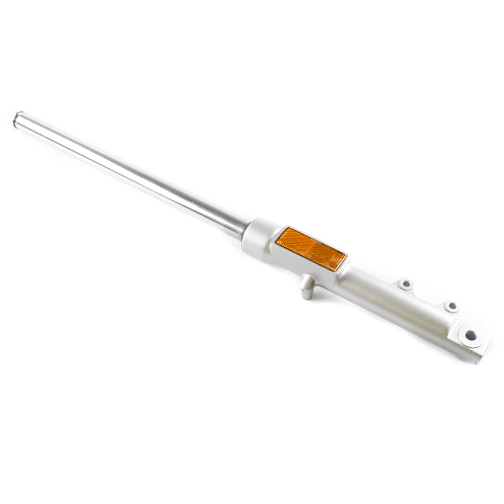 The left suspension fork in a motorcycle supports the front wheel, absorbs shocks from the road, and provides stability and control during riding, contributing to overall handling and comfort.
