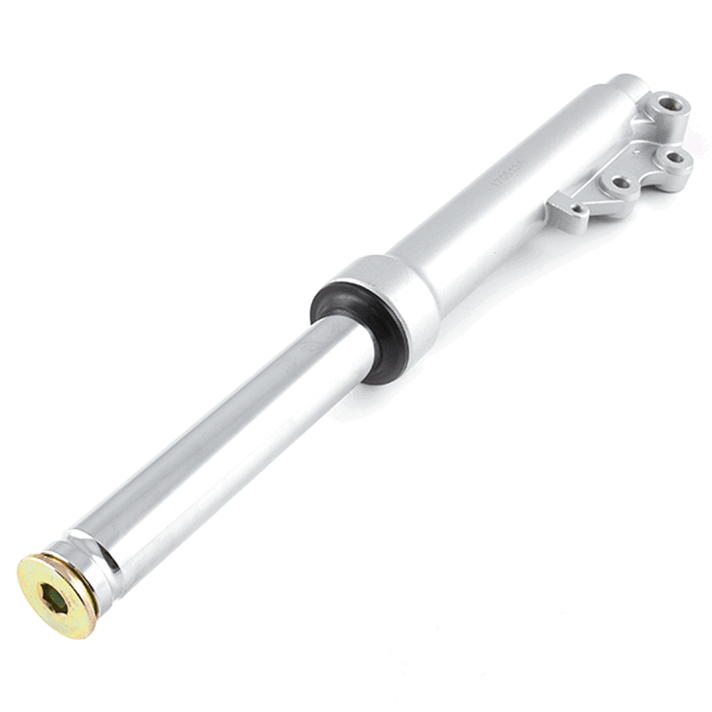The left suspension fork in a motorcycle supports the front wheel, absorbs shocks from the road, and provides stability and control during riding, contributing to overall handling and comfort.