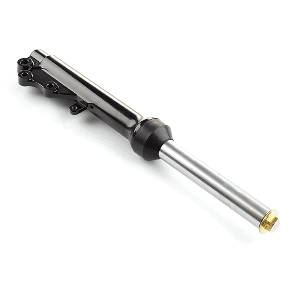 The left suspension fork in a motorcycle supports the front wheel, absorbs shocks from the road, and provides stability and control during riding, contributing to overall handling and comfort.