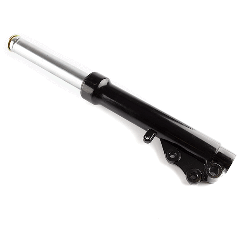 The left suspension fork in a motorcycle supports the front wheel, absorbs shocks from the road, and provides stability and control during riding, contributing to overall handling and comfort.