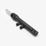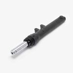 The left suspension fork in a motorcycle supports the front wheel, absorbs shocks from the road, and provides stability and control during riding, contributing to overall handling and comfort.
