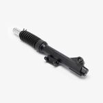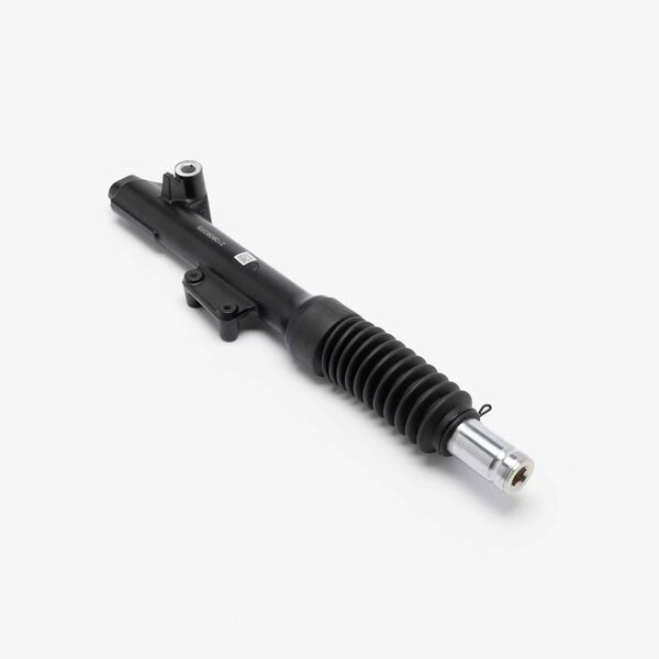 The left suspension fork in a motorcycle supports the front wheel, absorbs shocks from the road, and provides stability and control during riding, contributing to overall handling and comfort.