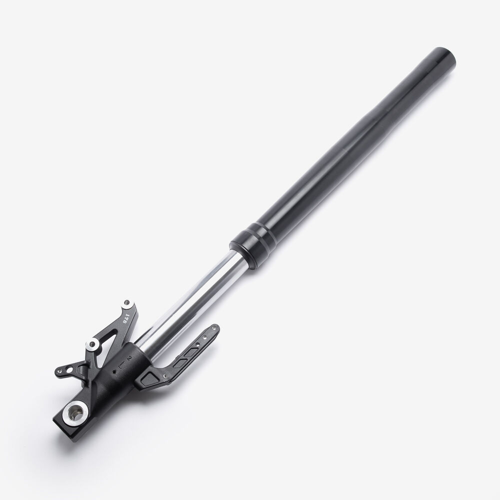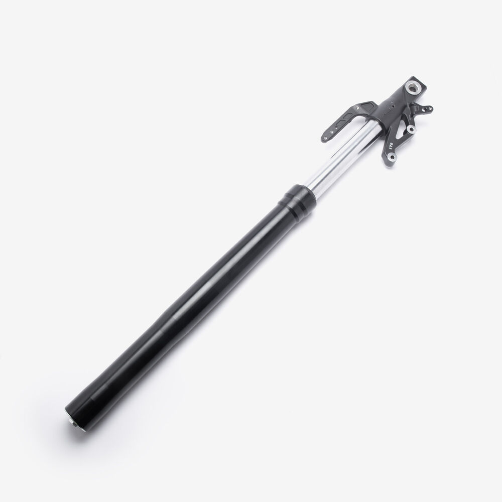 The left suspension fork in a motorcycle supports the front wheel, absorbs shocks from the road, and provides stability and control during riding, contributing to overall handling and comfort.