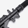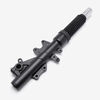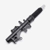 The left suspension fork in a motorcycle supports the front wheel, absorbs shocks from the road, and provides stability and control during riding, contributing to overall handling and comfort.