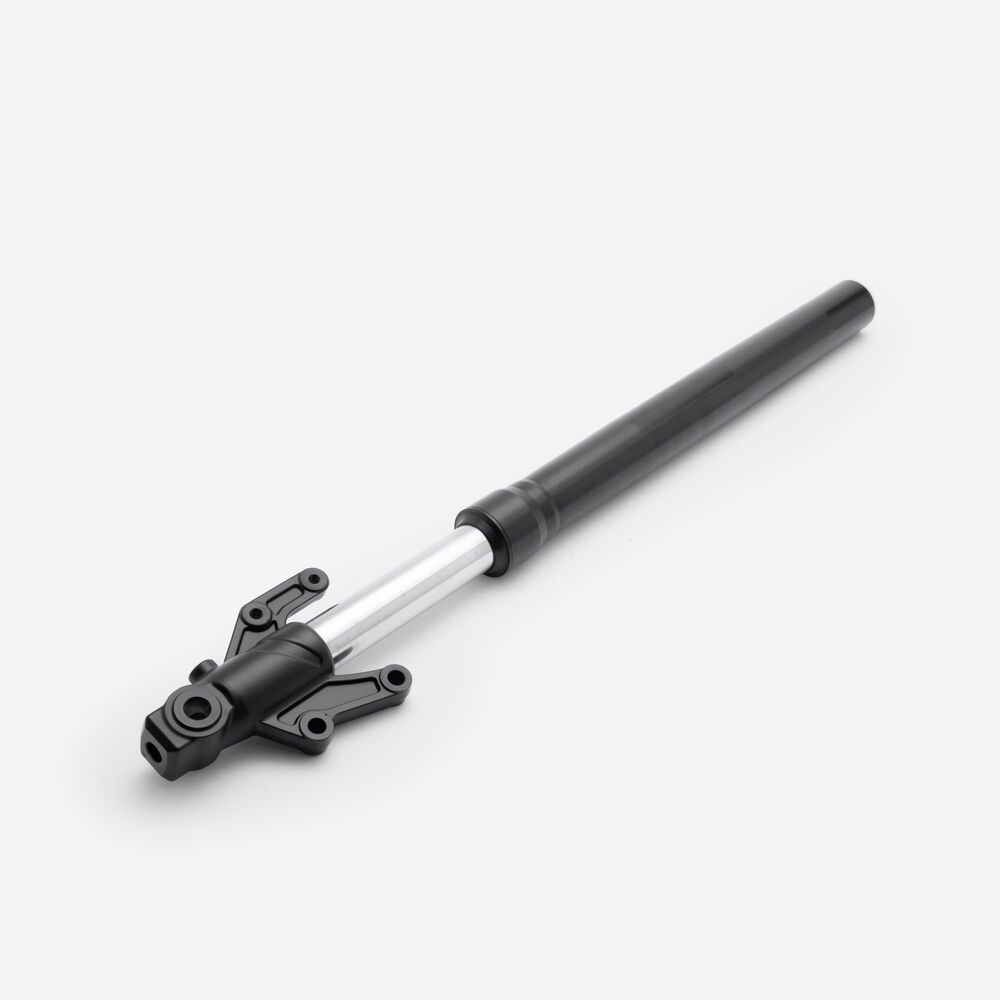 The left suspension fork in a motorcycle supports the front wheel, absorbs shocks from the road, and provides stability and control during riding, contributing to overall handling and comfort.