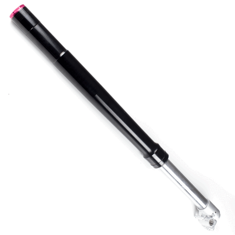 The right suspension fork in a motorcycle supports the front wheel, absorbs shocks from the road, and provides stability and control during riding, contributing to overall handling and comfort.