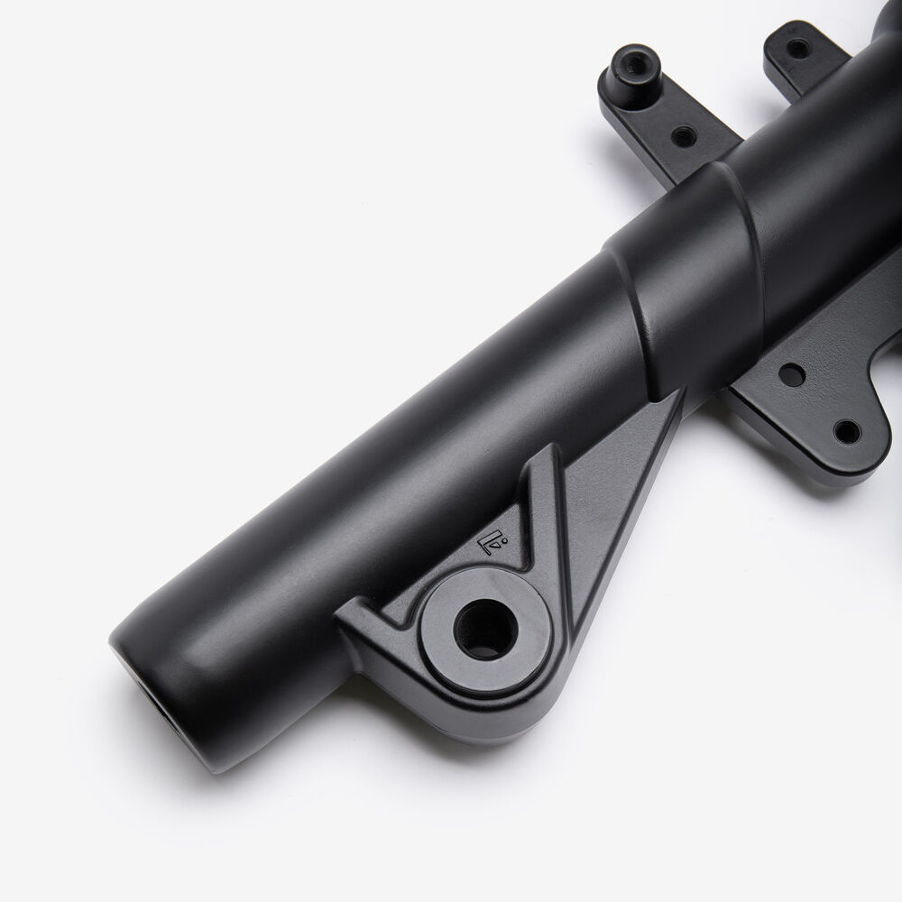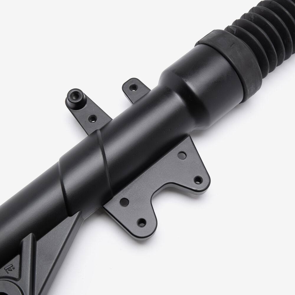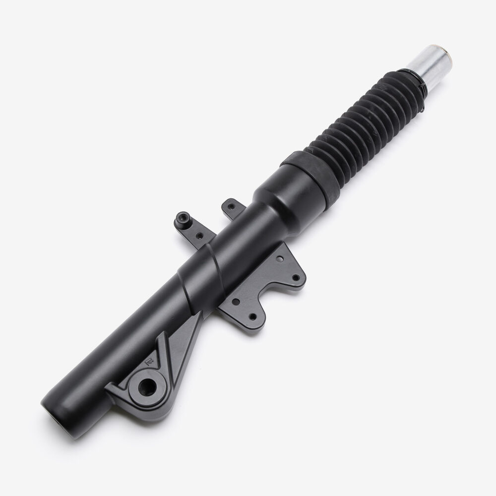 The right suspension fork in a motorcycle supports the front wheel, absorbs shocks from the road, and provides stability and control during riding, contributing to overall handling and comfort.