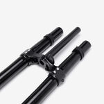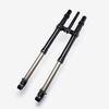The right suspension fork in a motorcycle supports the front wheel, absorbs shocks from the road, and provides stability and control during riding, contributing to overall handling and comfort.