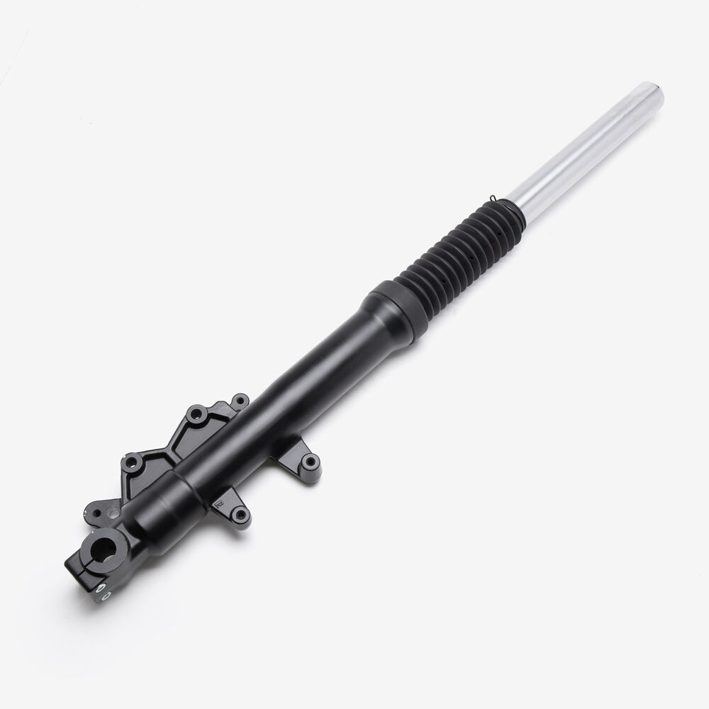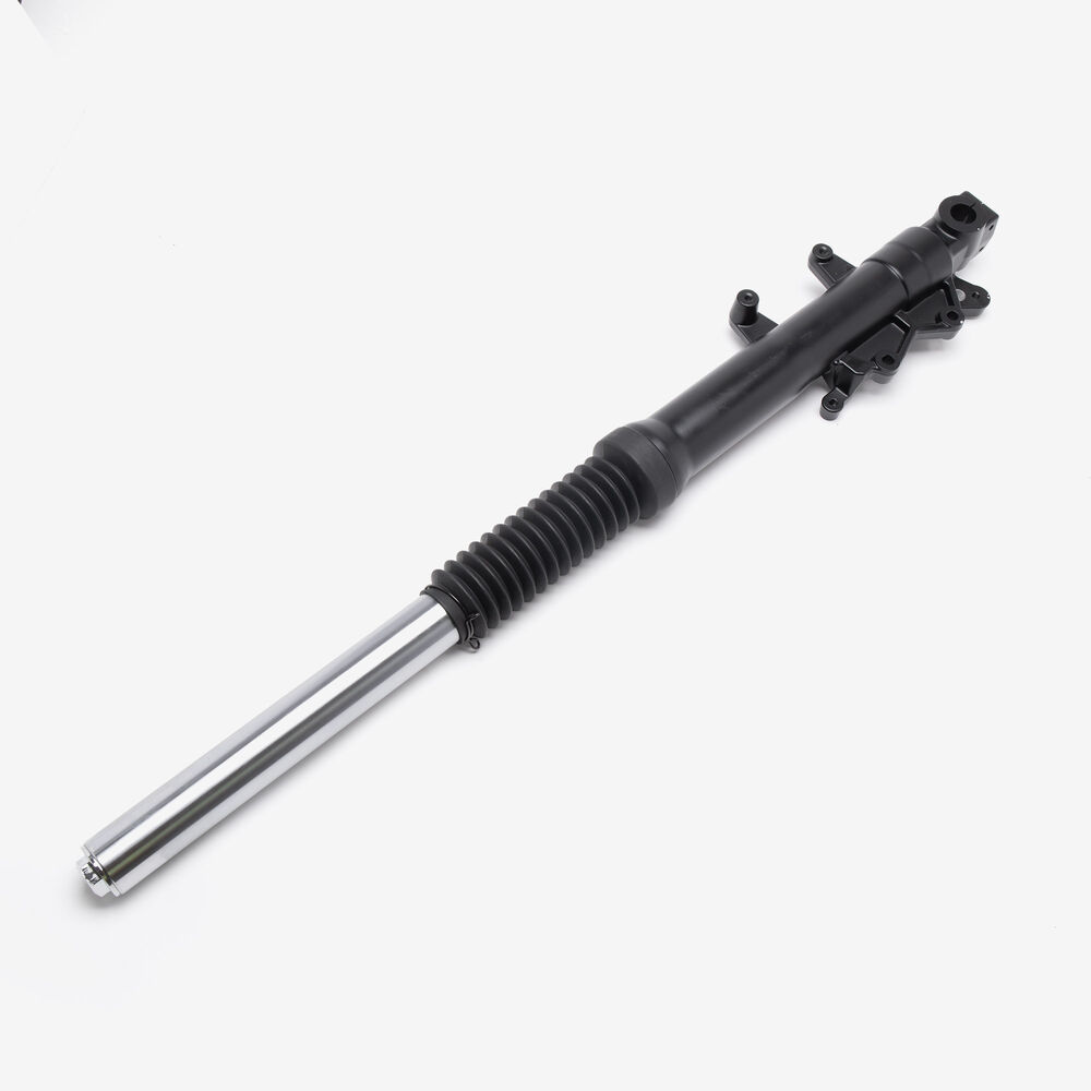 The right suspension fork in a motorcycle supports the front wheel, absorbs shocks from the road, and provides stability and control during riding, contributing to overall handling and comfort.
