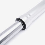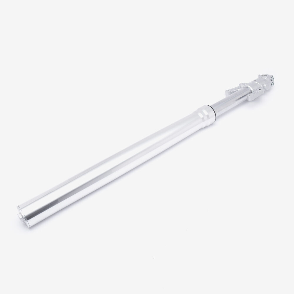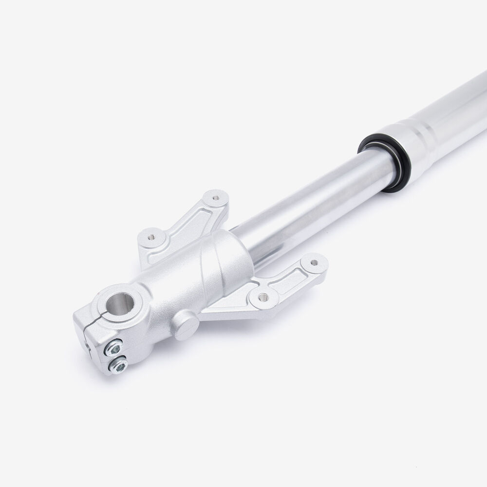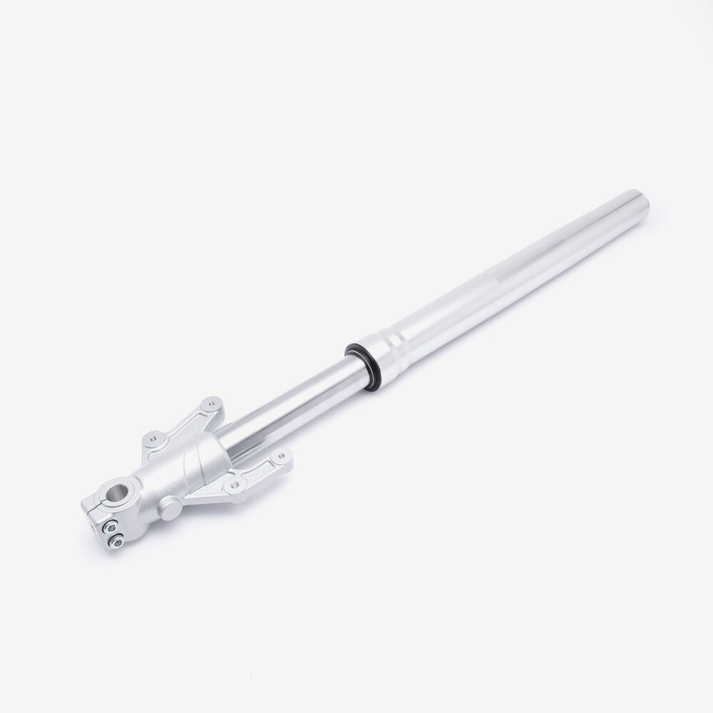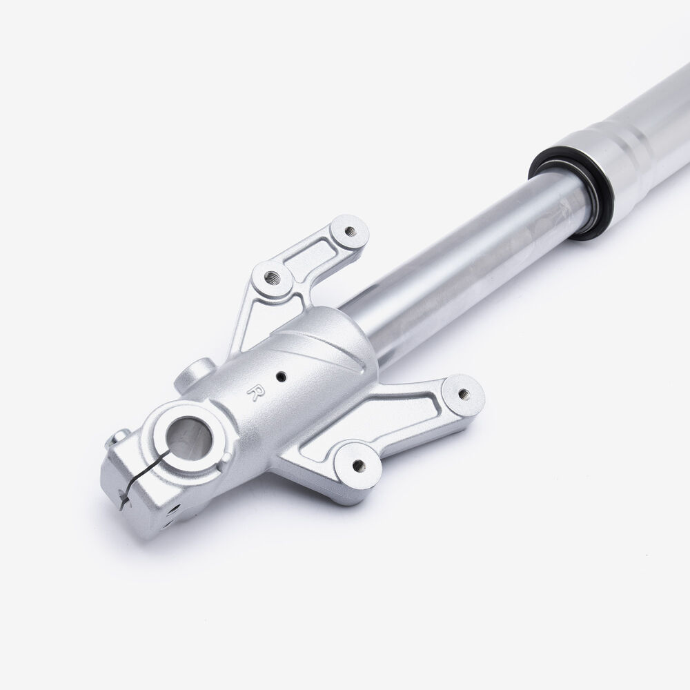 The right suspension fork in a motorcycle supports the front wheel, absorbs shocks from the road, and provides stability and control during riding, contributing to overall handling and comfort.