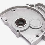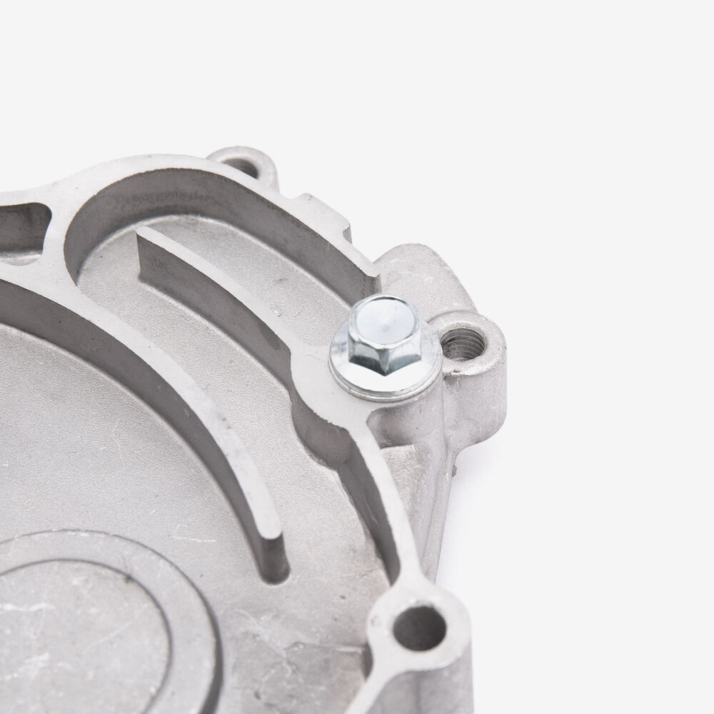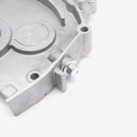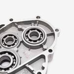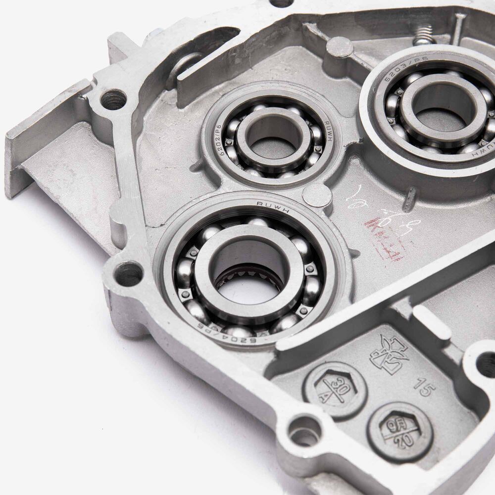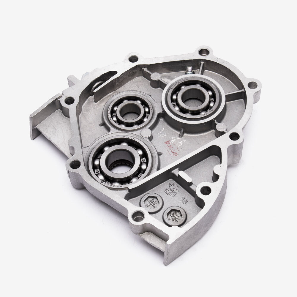 The gearbox casing in a scooter encloses and protects the gearbox components, housing the gears and shafts while ensuring proper lubrication and alignment for smooth transmission operation.