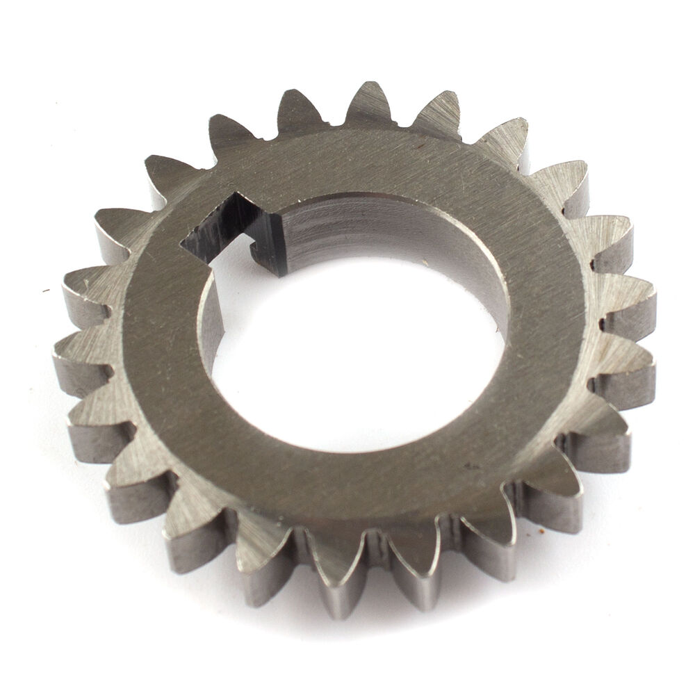 The oil pump drive gear in a motorcycle transmits rotational motion from the engine to the oil pump, ensuring proper circulation of oil for engine lubrication and cooling.