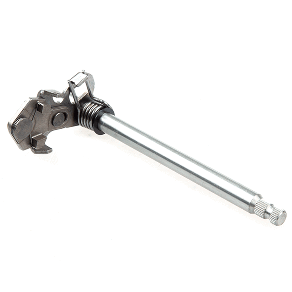 The gear selector shaft in a motorcycle transfers movement from the gear shift lever to the internal gearbox mechanism, enabling smooth and precise gear changes for optimal transmission performance.