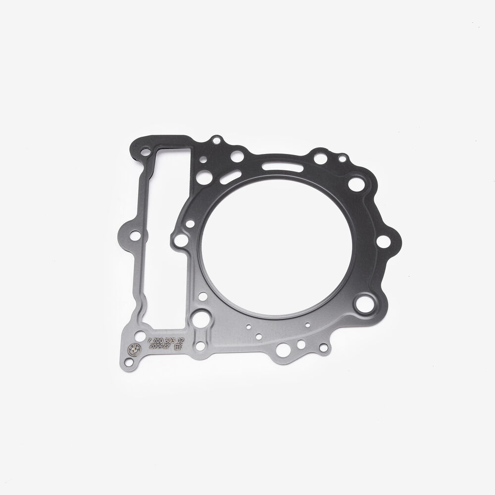 The head gasket in a motorcycle seals the engine block and cylinder head, preventing coolant and oil from mixing while maintaining compression within the combustion chamber. It is essential for engine integrity, ensuring efficient performance and preventing leaks.