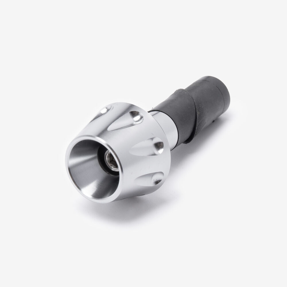 The handlebar end on a motorcycle is the component attached to the outermost part of the handlebar. It helps protect the handlebar from damage in the event of a fall or crash and can also serve as a mounting point for bar-end weights or mirrors. Designed for durability, it ensures the handlebar remains secure and functional.
