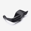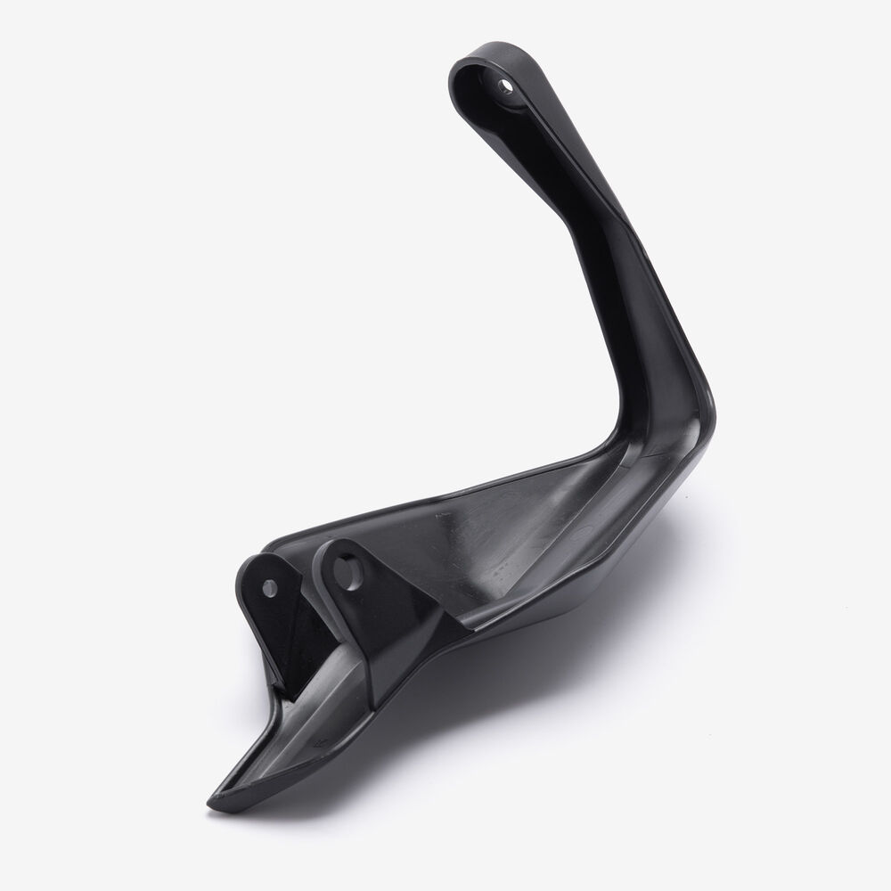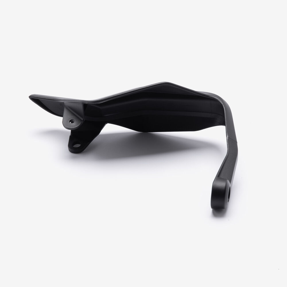 A hand guard or shield on a motorcycle is a protective accessory mounted on the handlebars. It shields the rider's hands from wind, debris, and impacts, enhancing comfort and safety.