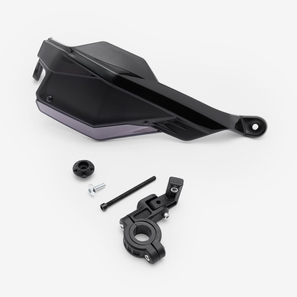 A hand guard or shield on a motorcycle is a protective accessory mounted on the handlebars. It shields the rider's hands from wind, debris, and impacts, enhancing comfort and safety.
