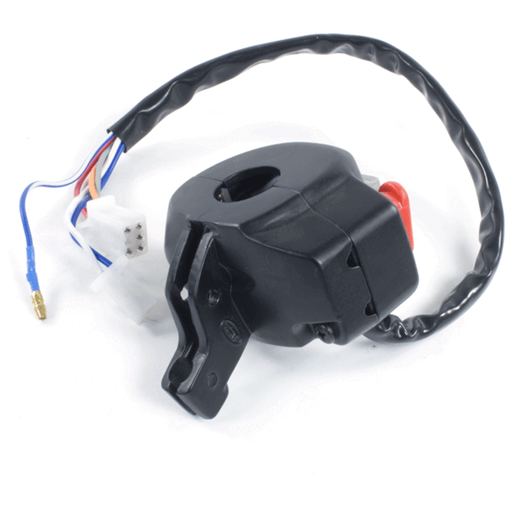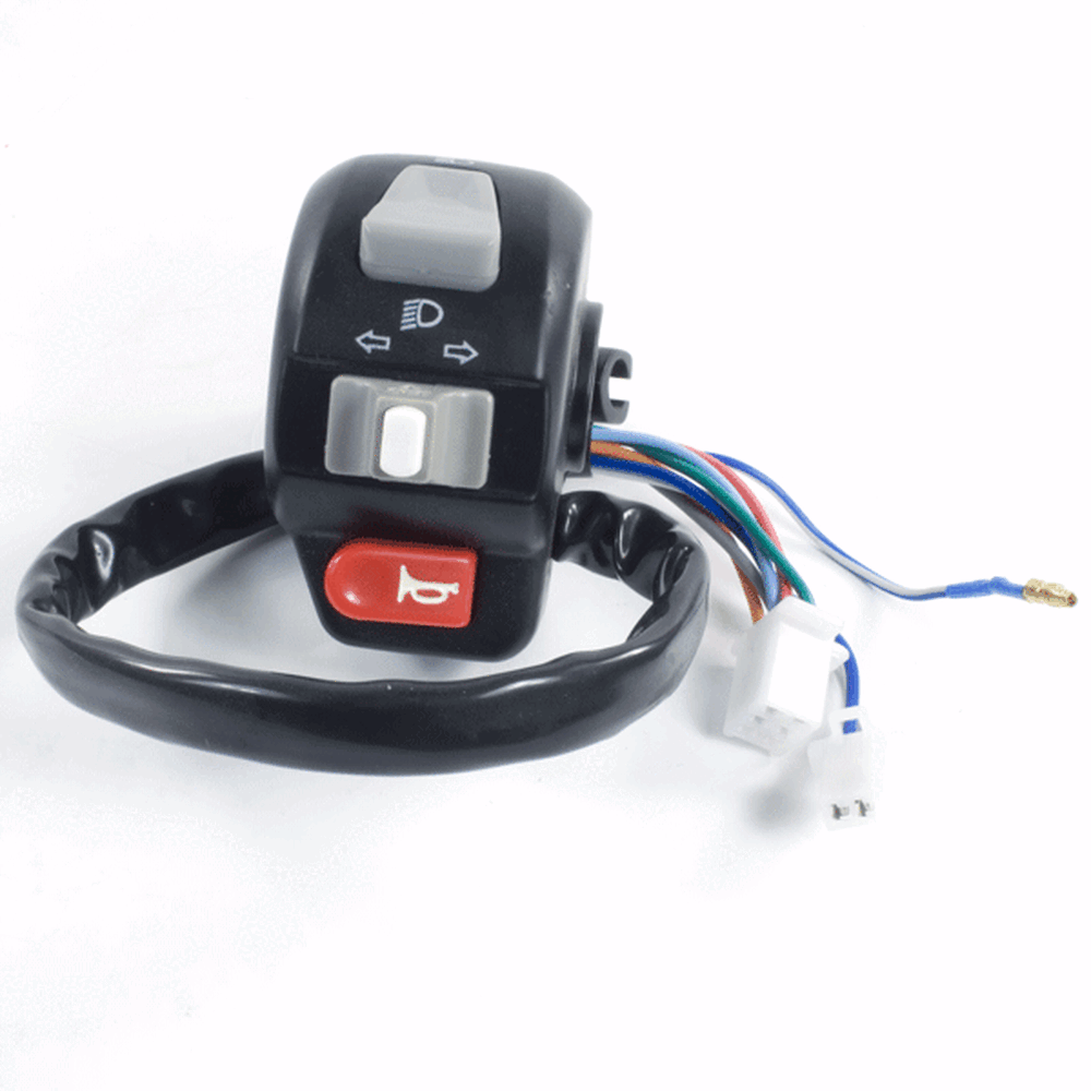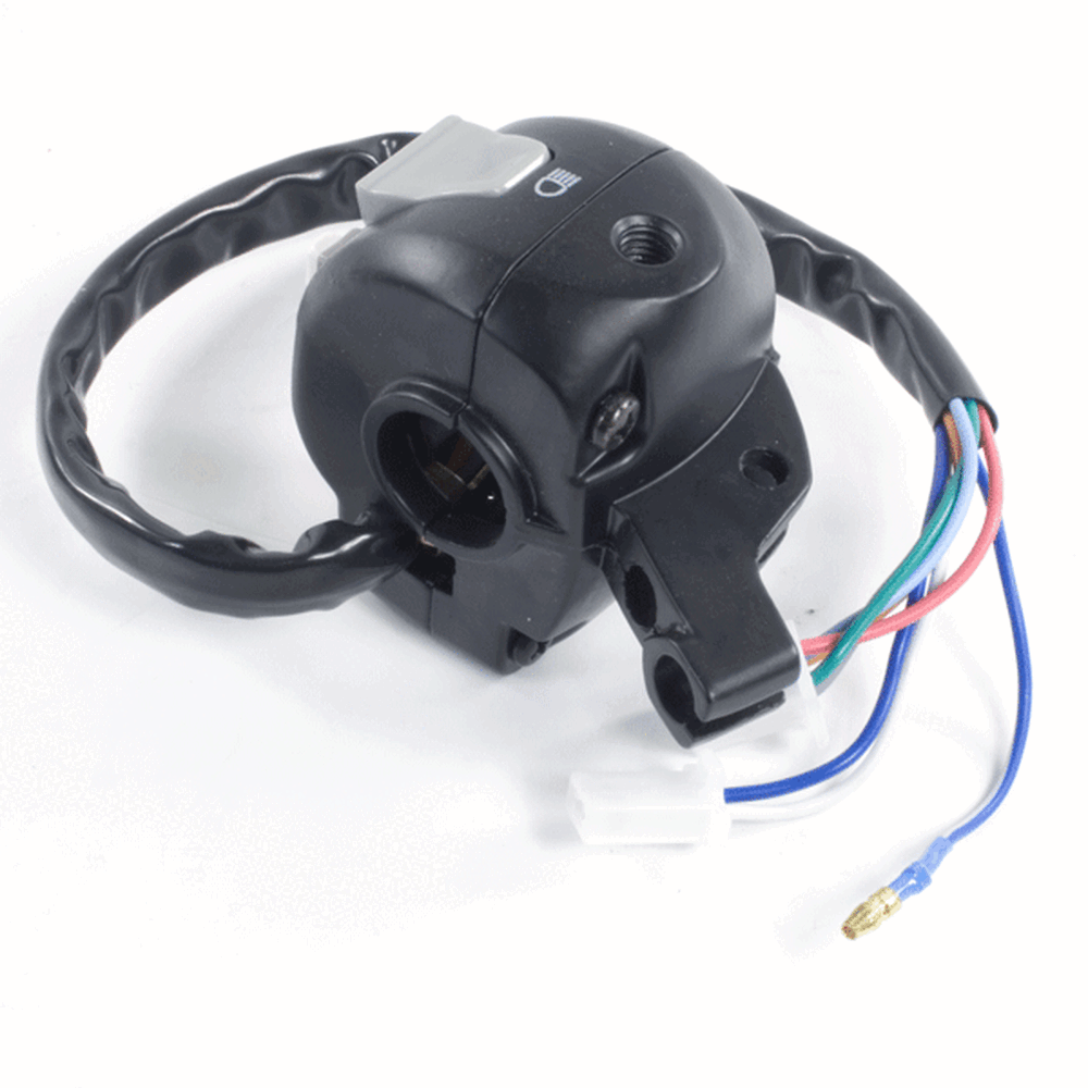 The left handlebar switch on a motorcycle is a control unit mounted on the left side of the handlebar. It typically includes switches for the horn, turn signals, and headlight controls. This switch allows the rider to operate essential functions easily while maintaining control of the motorcycle.
