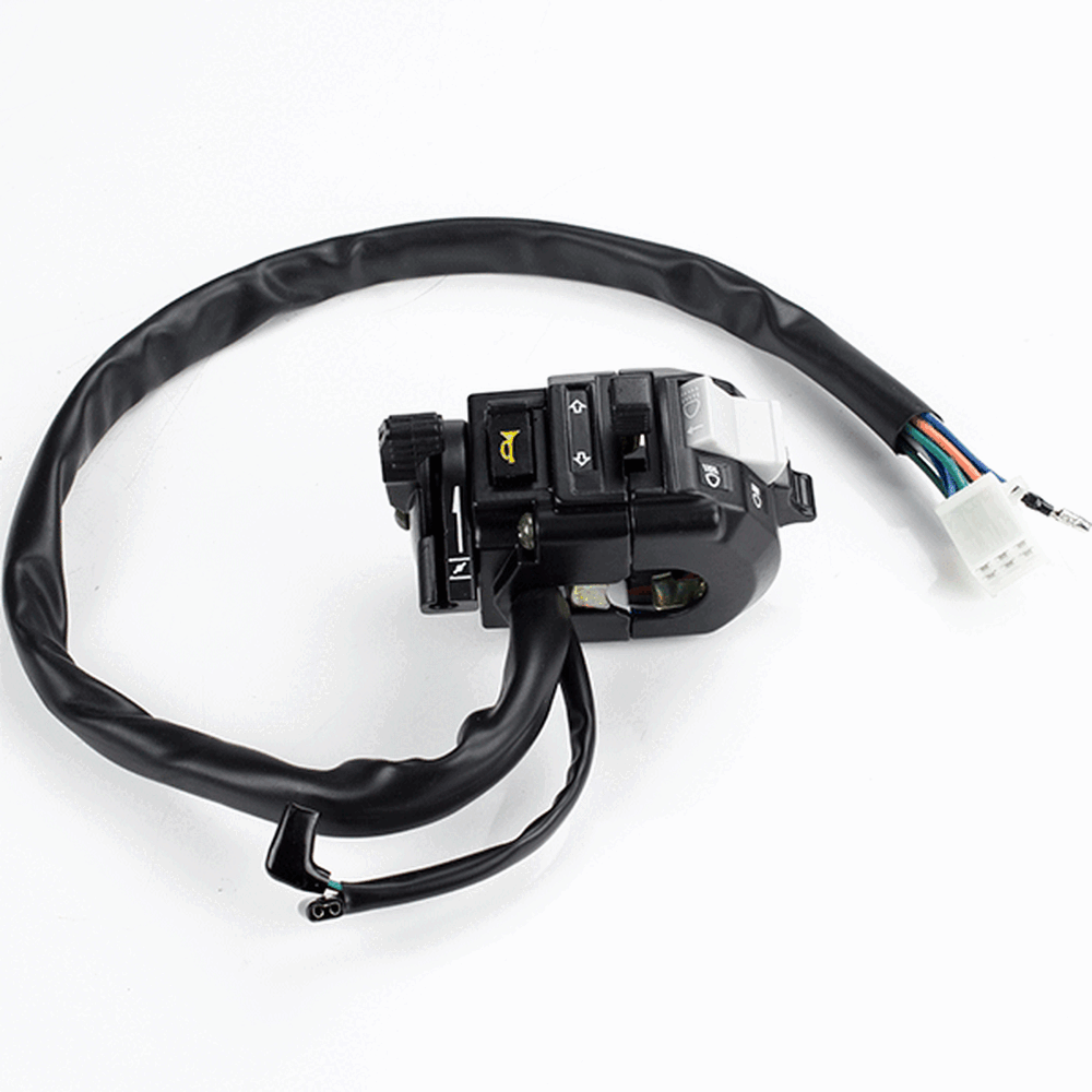 The left handlebar switch on a motorcycle is a control unit mounted on the left side of the handlebar. It typically includes switches for the horn, turn signals, and headlight controls. This switch allows the rider to operate essential functions easily while maintaining control of the motorcycle.