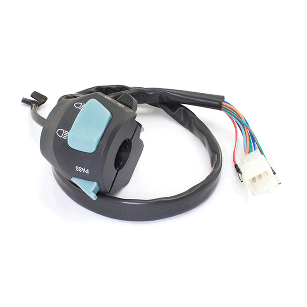 The left handlebar switch on a motorcycle is a control unit mounted on the left side of the handlebar. It typically includes switches for the horn, turn signals, and headlight controls. This switch allows the rider to operate essential functions easily while maintaining control of the motorcycle.