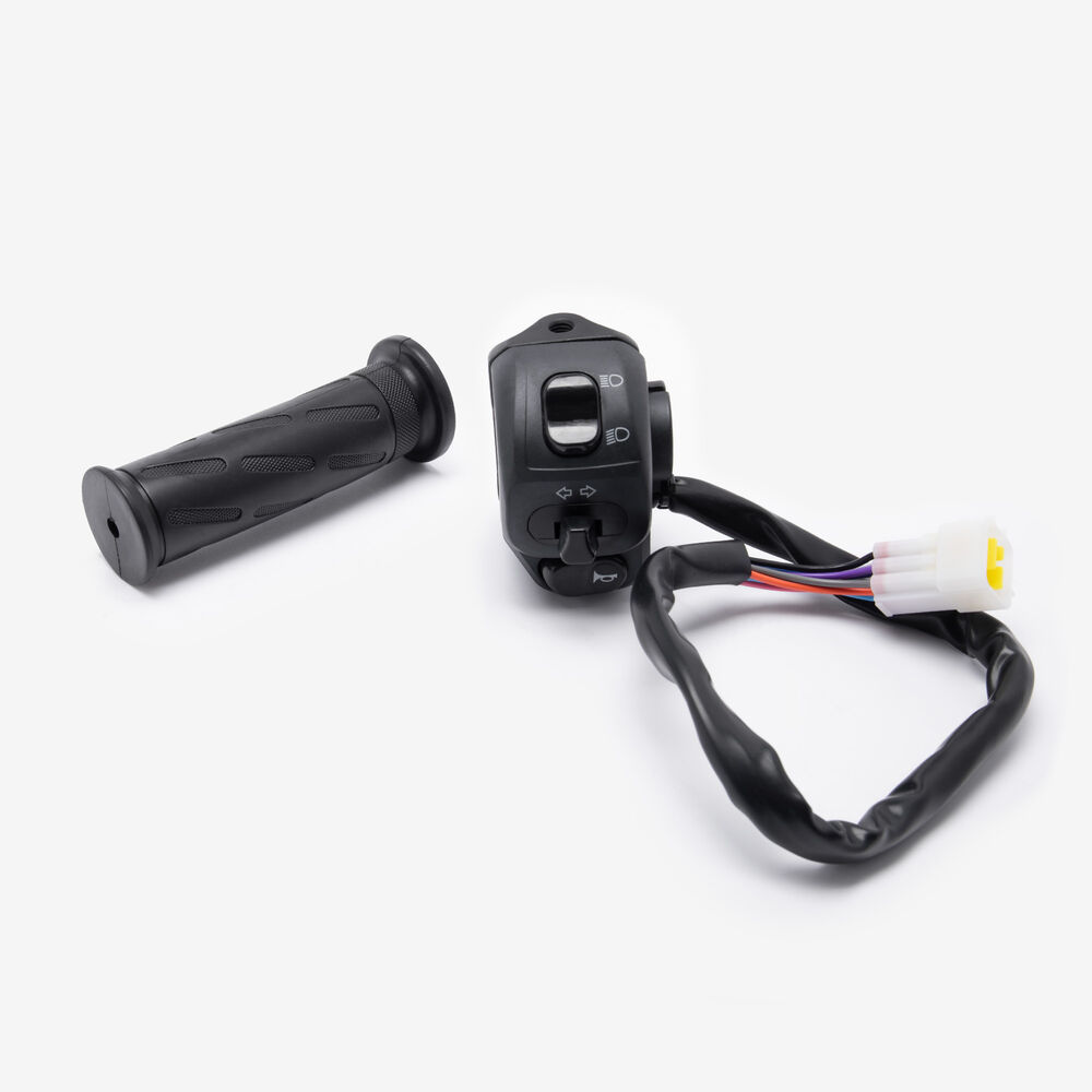 The left handlebar switch on a motorcycle is a control unit mounted on the left side of the handlebar. It typically includes switches for the horn, turn signals, and headlight controls. This switch allows the rider to operate essential functions easily while maintaining control of the motorcycle.