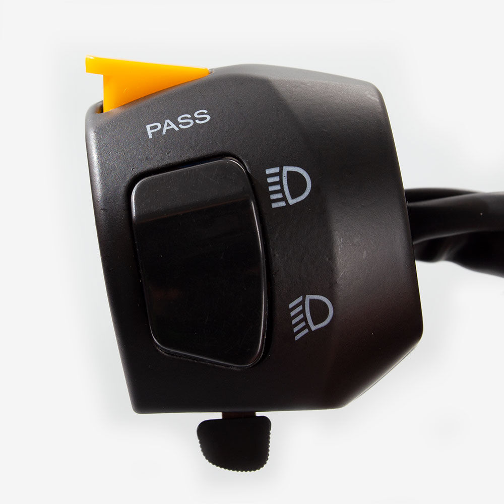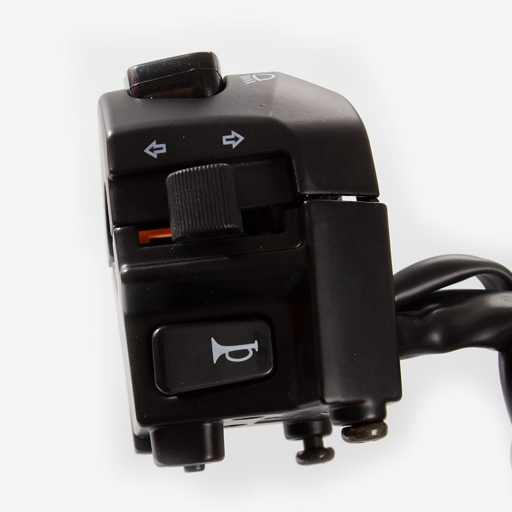 The left handlebar switch on a motorcycle is a control unit mounted on the left side of the handlebar. It typically includes switches for the horn, turn signals, and headlight controls. This switch allows the rider to operate essential functions easily while maintaining control of the motorcycle.