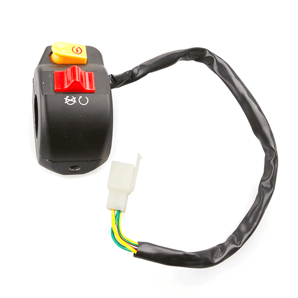 The handlebar switch (right) on a motorcycle is a control unit located on the right side of the handlebars. It typically includes switches for operating the throttle, and sometimes the starter button or other functions. Designed for easy access and ergonomic operation, it allows the rider to control essential functions while maintaining grip and control of the bike.