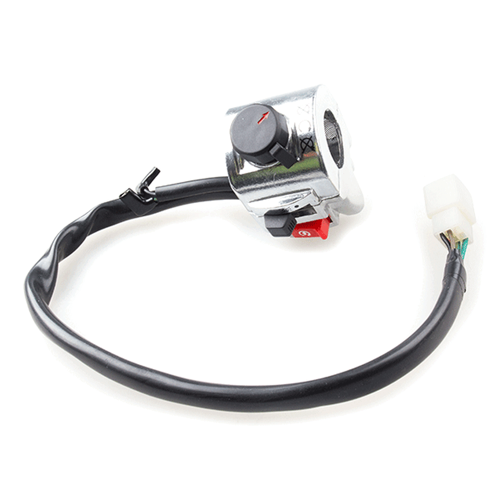 The handlebar switch (right) on a motorcycle is a control unit located on the right side of the handlebars. It typically includes switches for operating the throttle, and sometimes the starter button or other functions. Designed for easy access and ergonomic operation, it allows the rider to control essential functions while maintaining grip and control of the bike.