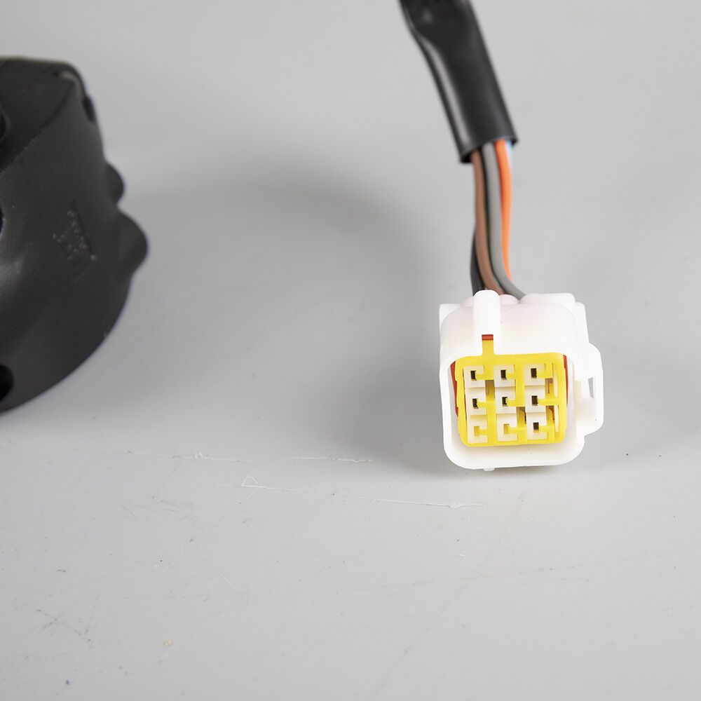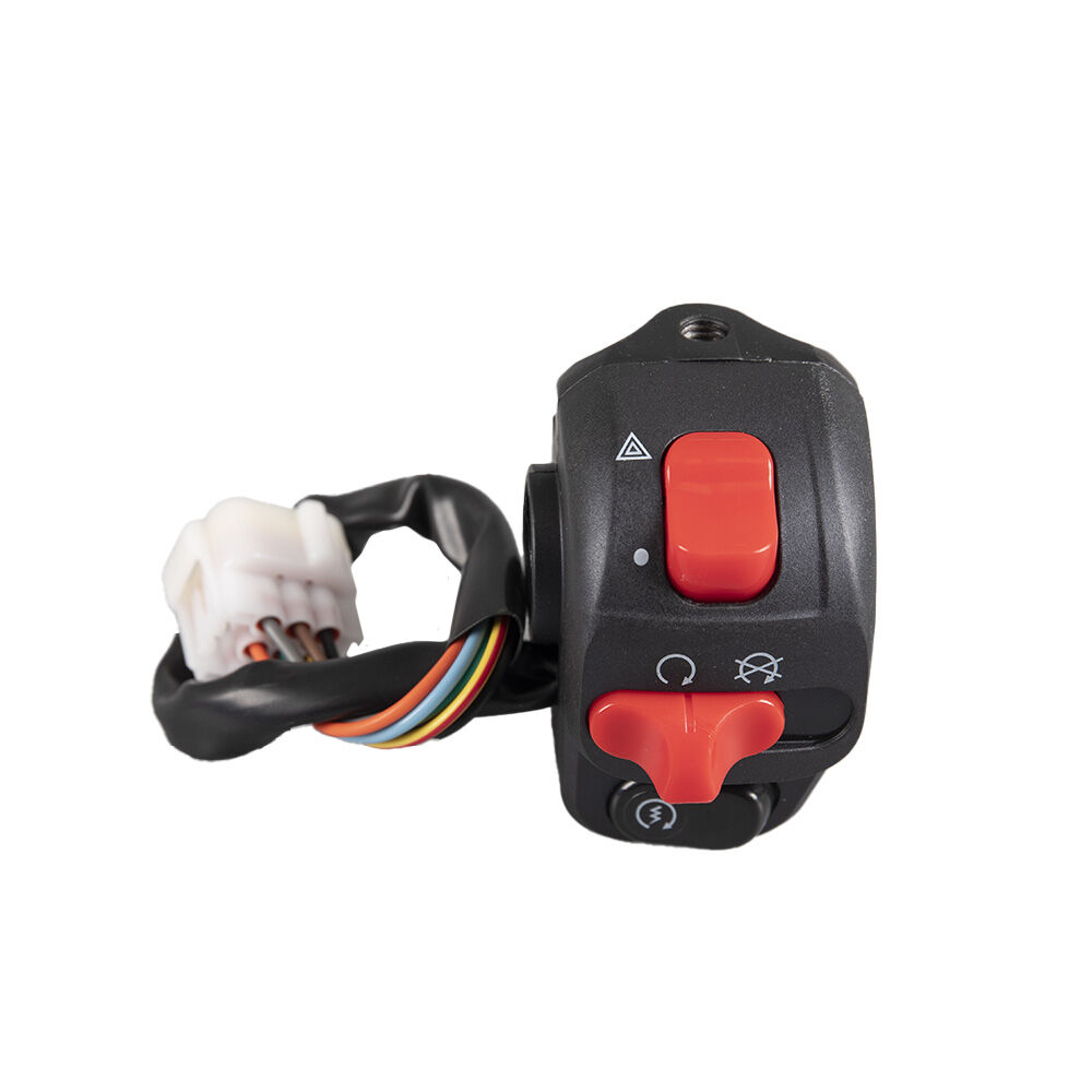 The handlebar switch (right) on a motorcycle is a control unit located on the right side of the handlebars. It typically includes switches for operating the throttle, and sometimes the starter button or other functions. Designed for easy access and ergonomic operation, it allows the rider to control essential functions while maintaining grip and control of the bike.
