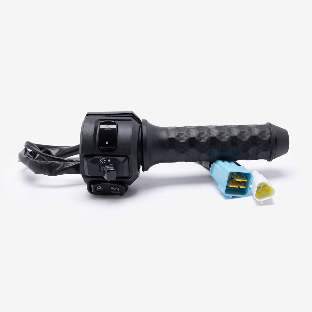 The handlebar switch (right) on a motorcycle is a control unit located on the right side of the handlebars. It typically includes switches for operating the throttle, and sometimes the starter button or other functions. Designed for easy access and ergonomic operation, it allows the rider to control essential functions while maintaining grip and control of the bike.