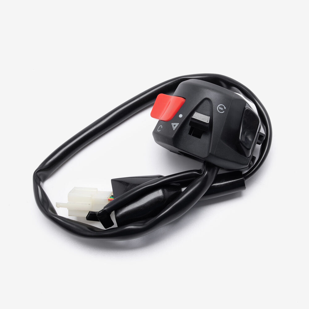 The handlebar switch (right) on a motorcycle is a control unit located on the right side of the handlebars. It typically includes switches for operating the throttle, and sometimes the starter button or other functions. Designed for easy access and ergonomic operation, it allows the rider to control essential functions while maintaining grip and control of the bike.