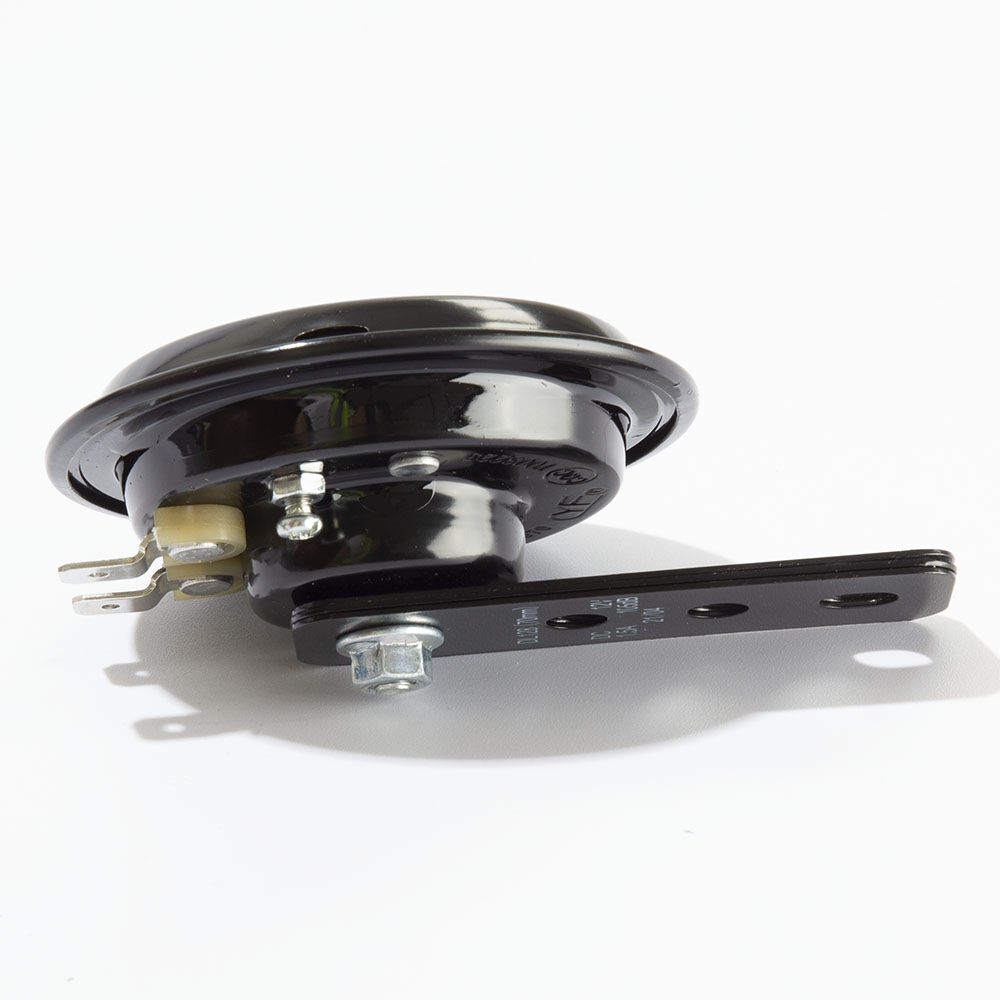 The horn on a motorcycle is an alert device used to produce a loud sound to warn or signal other road users. It is typically mounted on the front of the bike and activated by pressing a button or switch. The horn enhances safety by making the motorcycle more visible and audible in traffic.