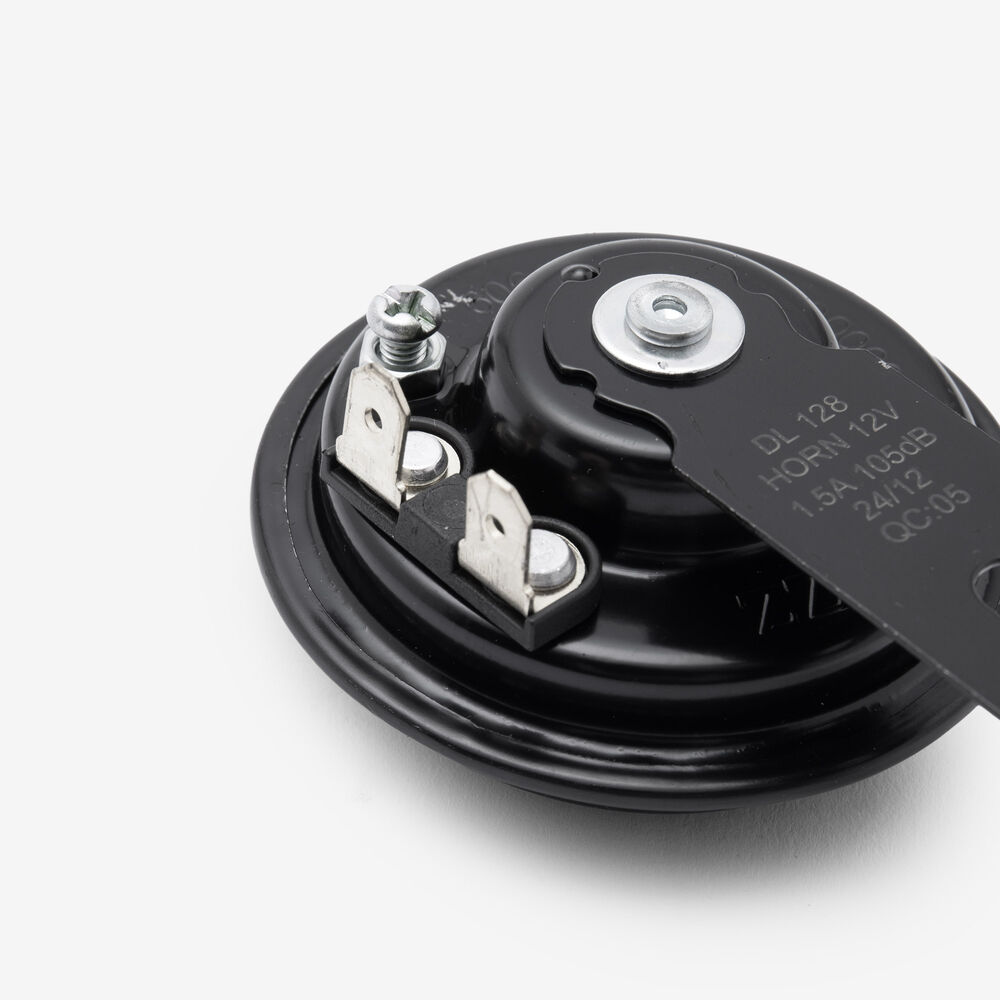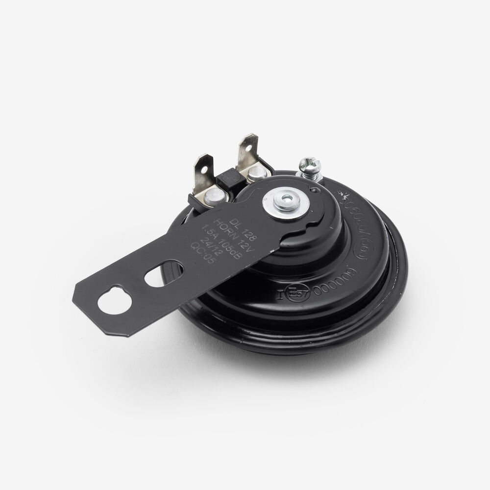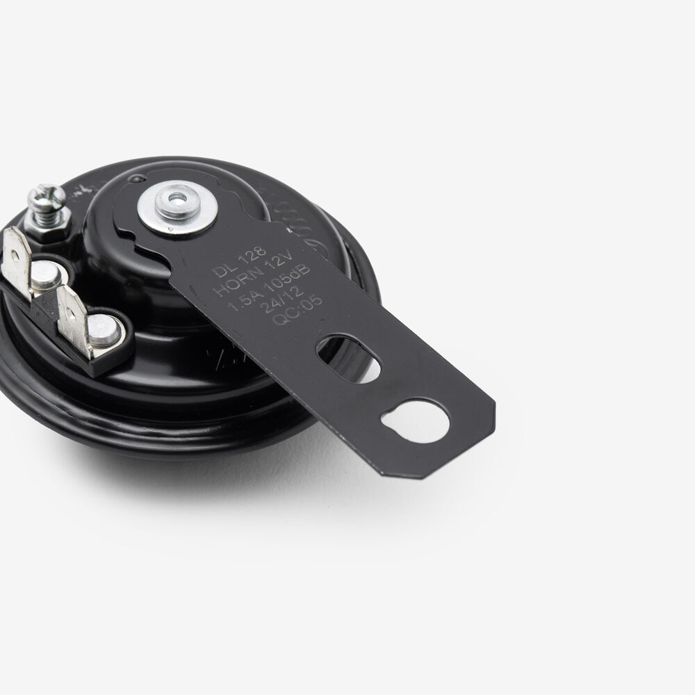 The horn on a motorcycle is an alert device used to produce a loud sound to warn or signal other road users. It is typically mounted on the front of the bike and activated by pressing a button or switch. The horn enhances safety by making the motorcycle more visible and audible in traffic.