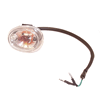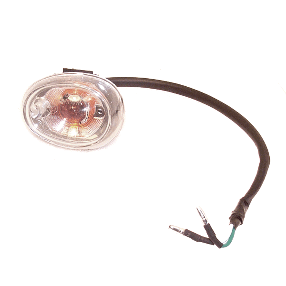 The indicator on a motorcycle is a signaling device used to communicate the rider's intent to turn or change lanes. It typically consists of a light that flashes to alert other road users. Mounted on the front and rear of the bike, indicators are essential for safety, helping to ensure that the rider's movements are clearly visible to others.
