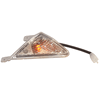 The indicator on a motorcycle is a signaling device used to communicate the rider's intent to turn or change lanes. It typically consists of a light that flashes to alert other road users. Mounted on the front and rear of the bike, indicators are essential for safety, helping to ensure that the rider's movements are clearly visible to others.