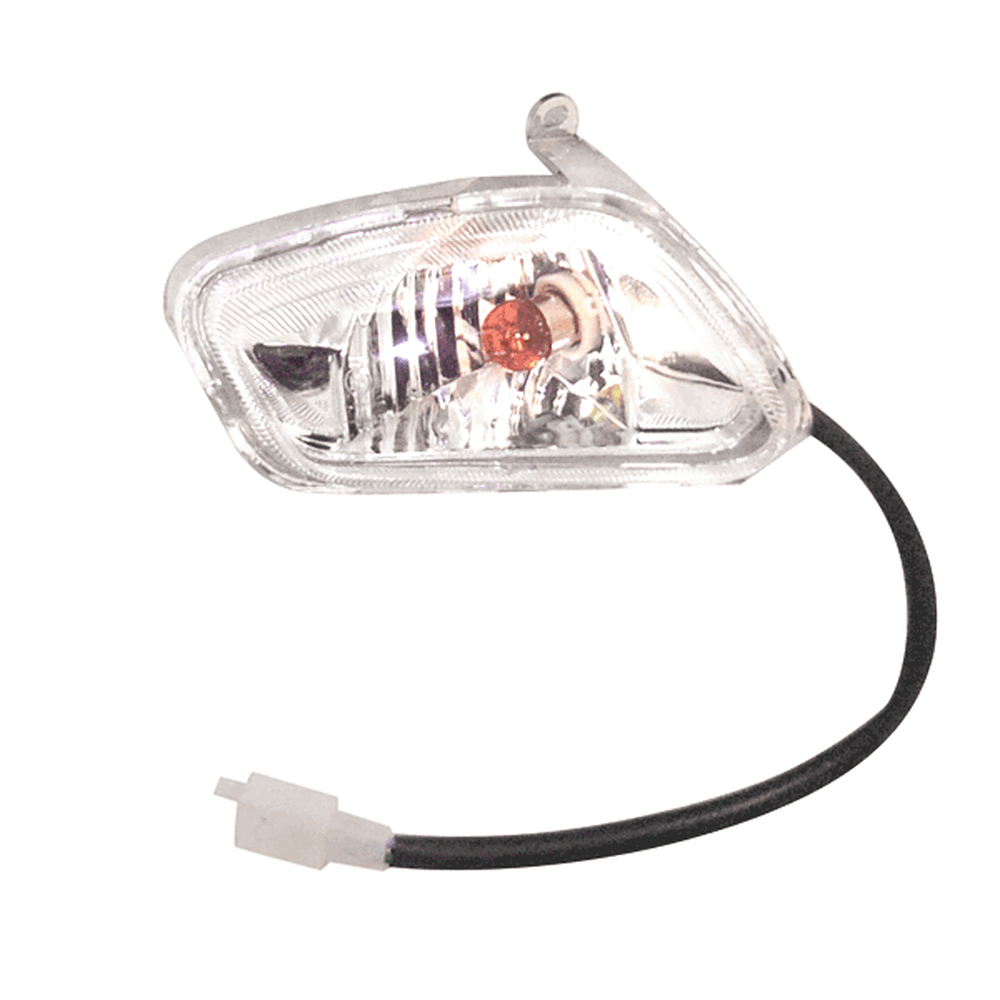 The indicator on a motorcycle is a signaling device used to communicate the rider's intent to turn or change lanes. It typically consists of a light that flashes to alert other road users. Mounted on the front and rear of the bike, indicators are essential for safety, helping to ensure that the rider's movements are clearly visible to others.