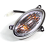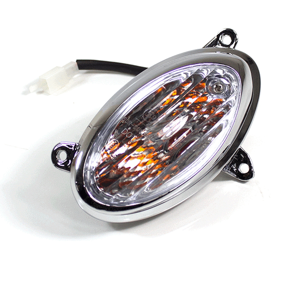 The indicator on a motorcycle is a signaling device used to communicate the rider's intent to turn or change lanes. It typically consists of a light that flashes to alert other road users. Mounted on the front and rear of the bike, indicators are essential for safety, helping to ensure that the rider's movements are clearly visible to others.