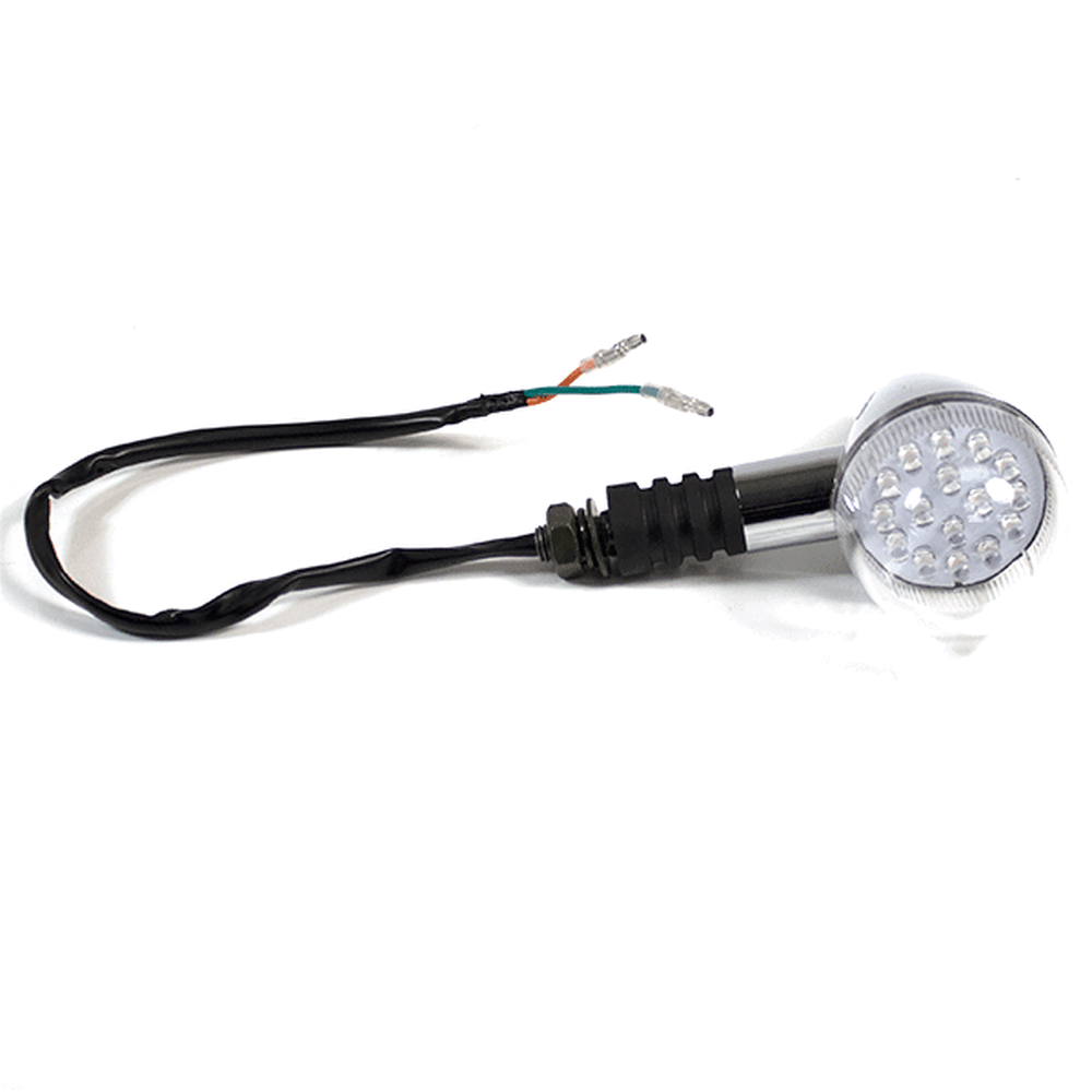 The indicator on a motorcycle is a signaling device used to communicate the rider's intent to turn or change lanes. It typically consists of a light that flashes to alert other road users. Mounted on the front and rear of the bike, indicators are essential for safety, helping to ensure that the rider's movements are clearly visible to others.