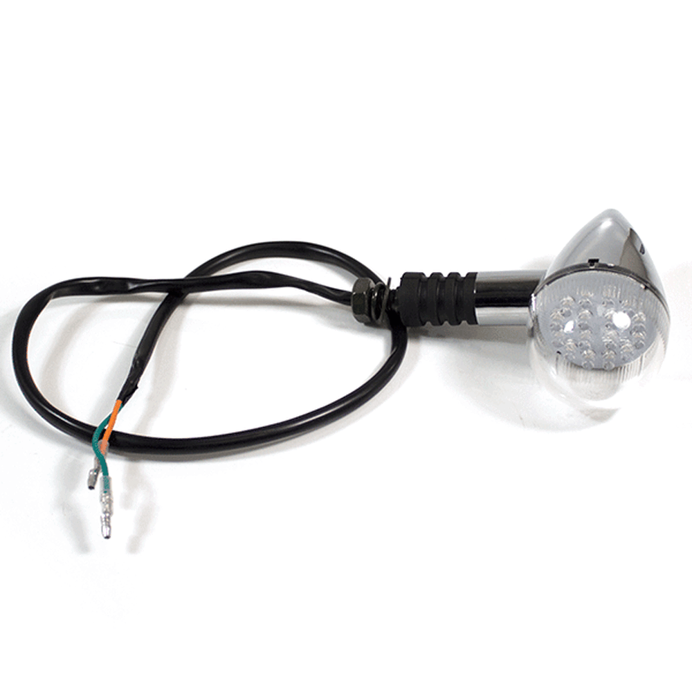 The indicator on a motorcycle is a signaling device used to communicate the rider's intent to turn or change lanes. It typically consists of a light that flashes to alert other road users. Mounted on the front and rear of the bike, indicators are essential for safety, helping to ensure that the rider's movements are clearly visible to others.