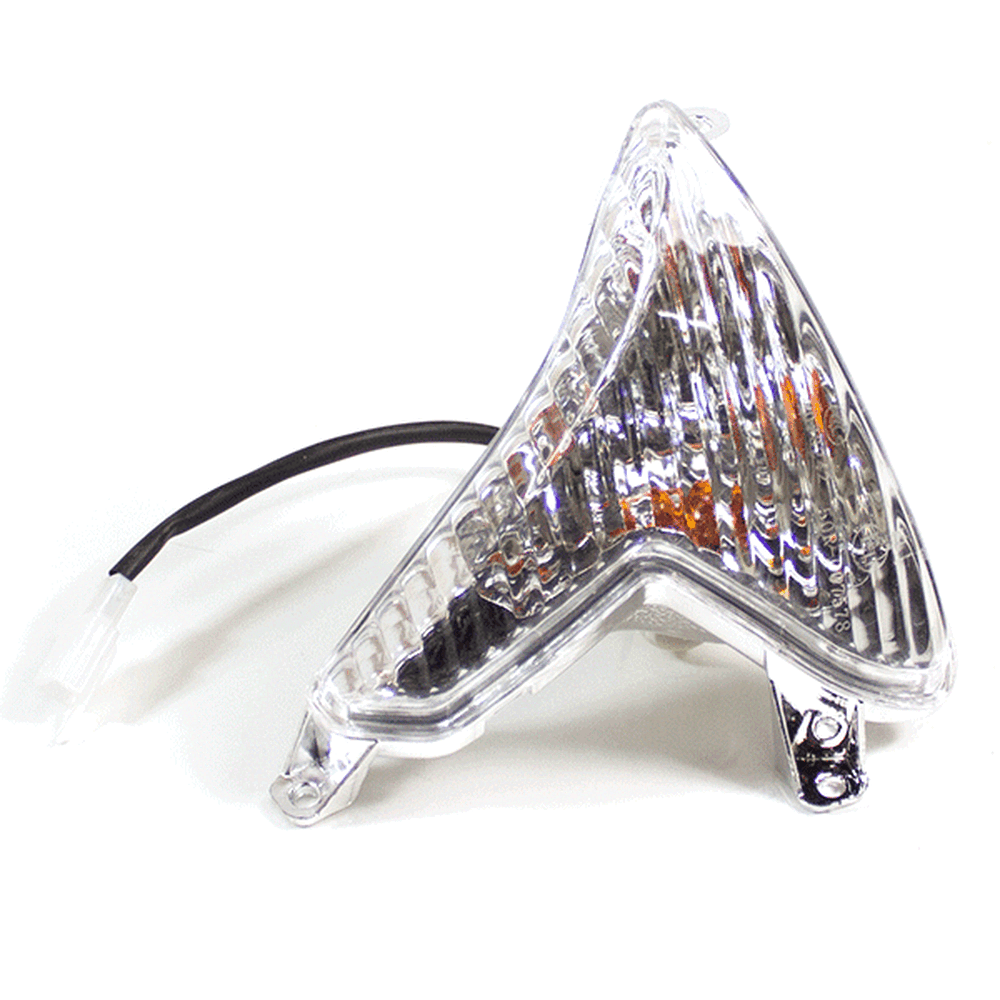 The indicator on a motorcycle is a signaling device used to communicate the rider's intent to turn or change lanes. It typically consists of a light that flashes to alert other road users. Mounted on the front and rear of the bike, indicators are essential for safety, helping to ensure that the rider's movements are clearly visible to others.