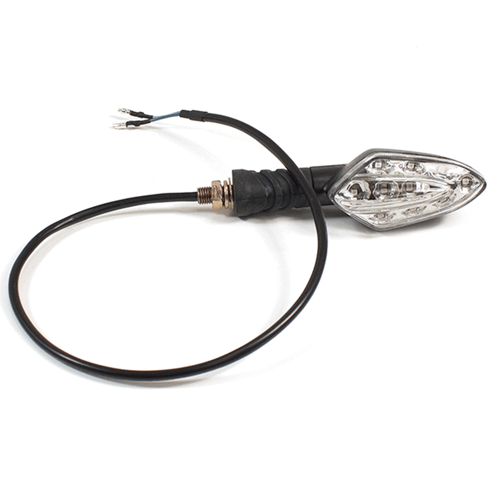 The indicator on a motorcycle is a signaling device used to communicate the rider's intent to turn or change lanes. It typically consists of a light that flashes to alert other road users. Mounted on the front and rear of the bike, indicators are essential for safety, helping to ensure that the rider's movements are clearly visible to others.