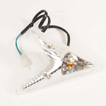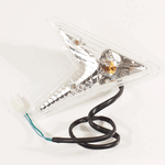 The indicator on a motorcycle is a signaling device used to communicate the rider's intent to turn or change lanes. It typically consists of a light that flashes to alert other road users. Mounted on the front and rear of the bike, indicators are essential for safety, helping to ensure that the rider's movements are clearly visible to others.