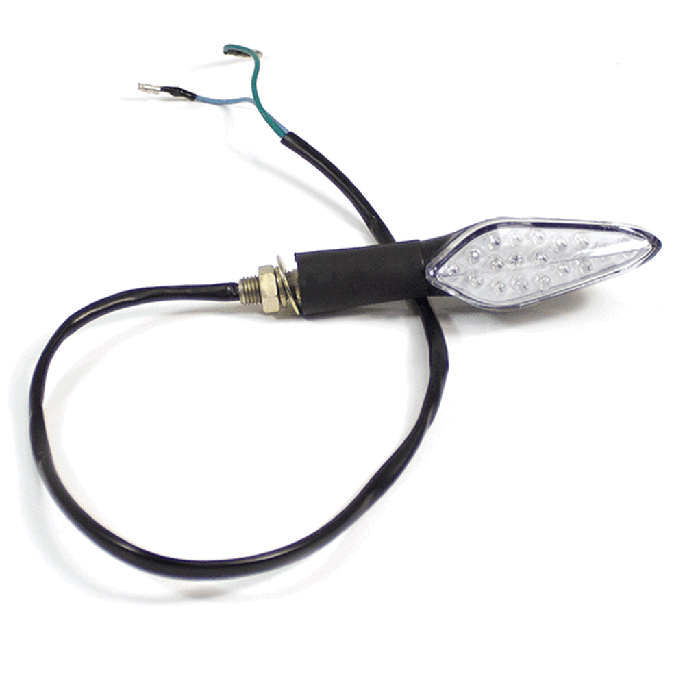 The indicator on a motorcycle is a signaling device used to communicate the rider's intent to turn or change lanes. It typically consists of a light that flashes to alert other road users. Mounted on the front and rear of the bike, indicators are essential for safety, helping to ensure that the rider's movements are clearly visible to others.