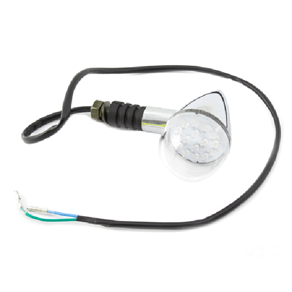 The indicator on a motorcycle is a signaling device used to communicate the rider's intent to turn or change lanes. It typically consists of a light that flashes to alert other road users. Mounted on the front and rear of the bike, indicators are essential for safety, helping to ensure that the rider's movements are clearly visible to others.