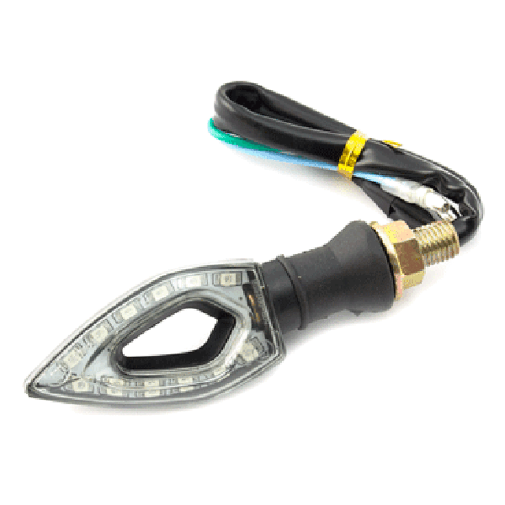 The indicator on a motorcycle is a signaling device used to communicate the rider's intent to turn or change lanes. It typically consists of a light that flashes to alert other road users. Mounted on the front and rear of the bike, indicators are essential for safety, helping to ensure that the rider's movements are clearly visible to others.